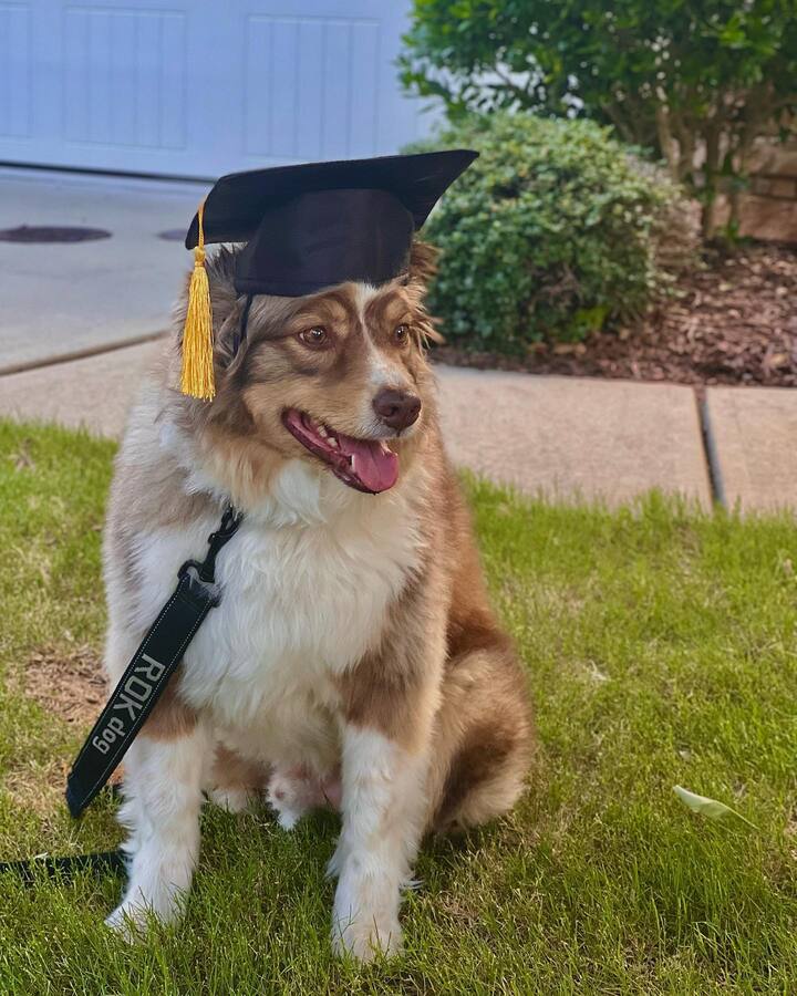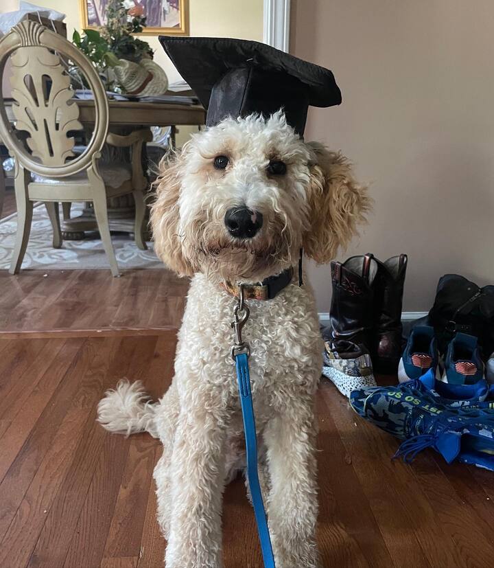 Roxie was born in Rougement, North Carolina on October 15, 2021, about 20 miles from her current home. She is a moyen poodle (“moyen” is French for medium) and she’s about 50 pounds. She looks like a doodle because of her haircut (mom likes her fuzzy face!), but she’s a poodle.